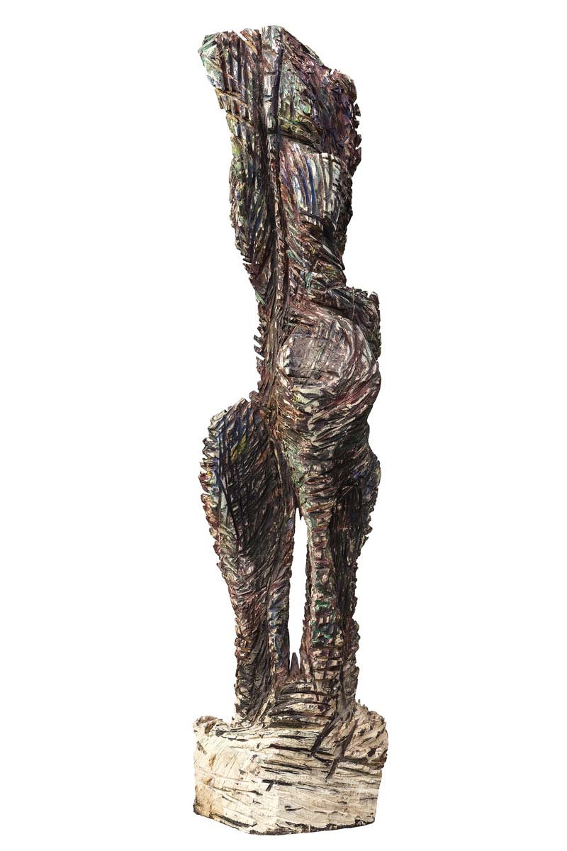Die aktuelle Ausstellung zeigt Holzarbeiten der Bildhauerin Stephanie Hermes aus Korschenbroich. In der Mitte des Raums steht eine lebensgroße, farbig gefasste Holzskulptur mit dem Titel „Wesen 16 (Die große Frau)“ aus Lindenholz. An den Wänden sind drei Holzreliefs mit dem Titel „Relief 16 (I bis III)“ zu sehen, die ebenfalls aus Lindenholz gefertigt sind und mit Implantaten aus Edelstahl ergänzt sind.