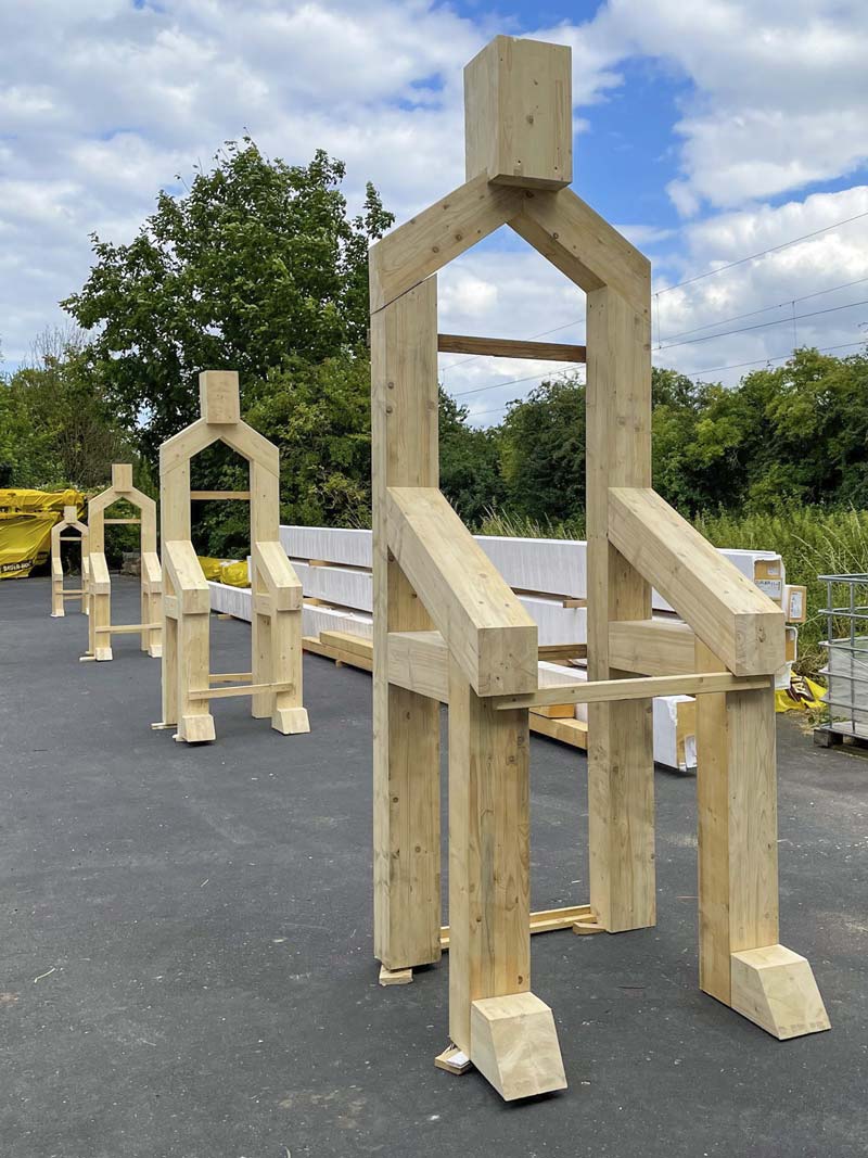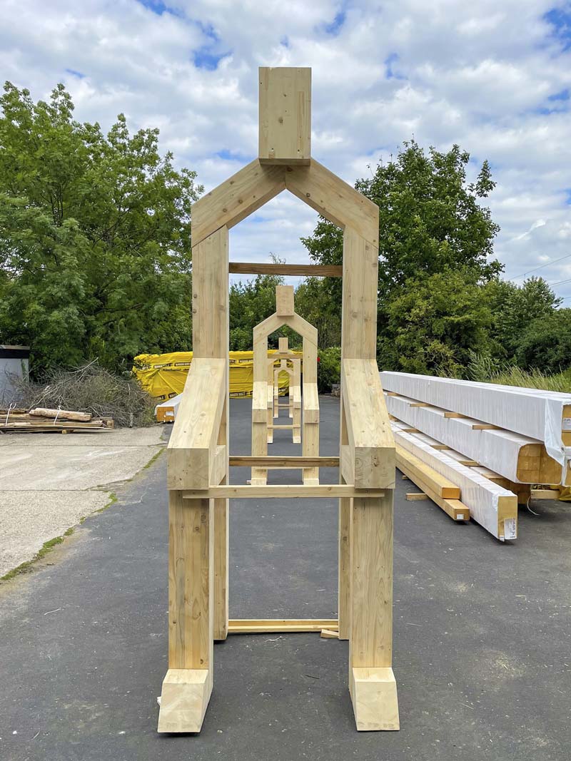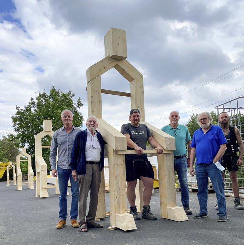 Vor ein paar Tagen konnten wir zum ersten Mal die neuen, fast fertigen Türhüter bewundern. Die Zimmerei Drossard hat mit ihren Zimmermännern ganze Arbeit geleistet. Imposant stehen die vier Holzfiguren auf dem Werkhof. Bildhauer Wilhelm Schiefer hat die einzelnen Skulpturen im richtigen Abstand zueinander platziert. Genauso wird das Figurenensemble auch im Vorster Wald aufgestellt werden.