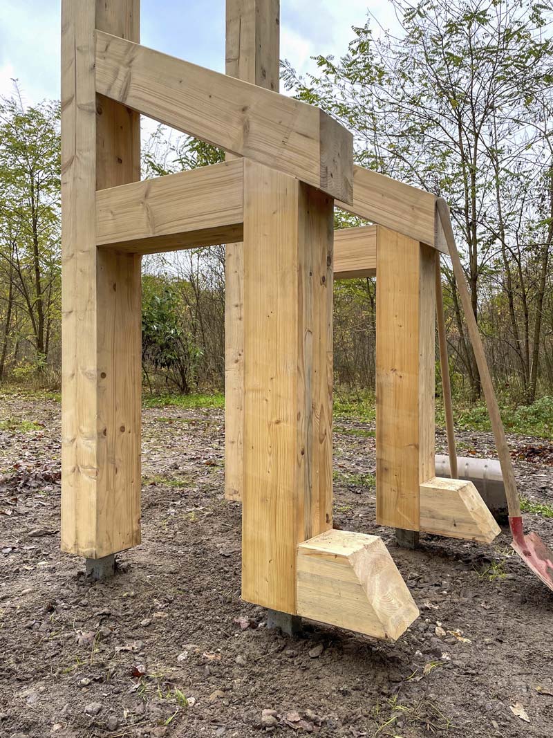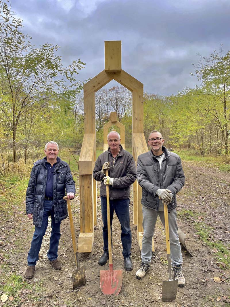 Vorbereitungen für die Einweihung 15. November 20215. Februar 2026 Letzte Vorbereitungen Heute noch ein wenig das Gelände hergerichtet und die Fundamente mit Waldboden bedeckt. Im Frühjahr säen wir Gras. Vorstandsmitglieder v.l.: Klaus-Dieter Pruss, Markus Albiez und Markus-Maria Hoffmann