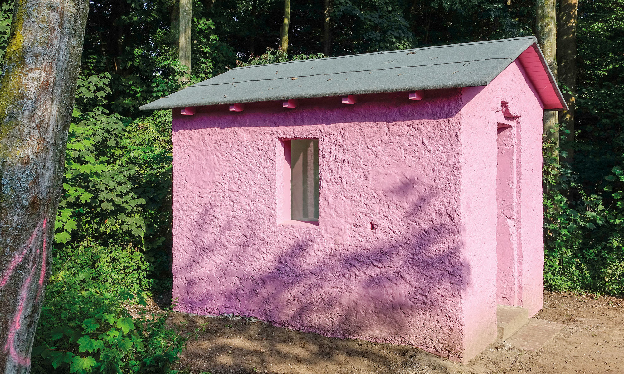 Leider wurde die Waldhütte immer wieder durch Schmierereien verschandelt und die Glastür durch rohe Gewalt zerstört. Aus diesem Grund hatten wir in Abstimmung mit der Künstlerin Monika Nelles die Waldhütte gründlich saniert. Wie ein Chamäleon wechselte die Waldhütte die Farbe. Ursprünglich rosa ist sie jetzt gelb. An einer Ecke kann man noch die Vorgängerfarbe erkennen, sodass der Verwandlungsprozess sichtbar bleibt. Auch die Glastür wurde ersetzt. Wir hofften, dass die kostspielige Sanierung respektiert wird. Das war nicht der Fall. Wir werden uns weiterhin um die Waldhütte kümmern und sie beschützen, so gut es geht.