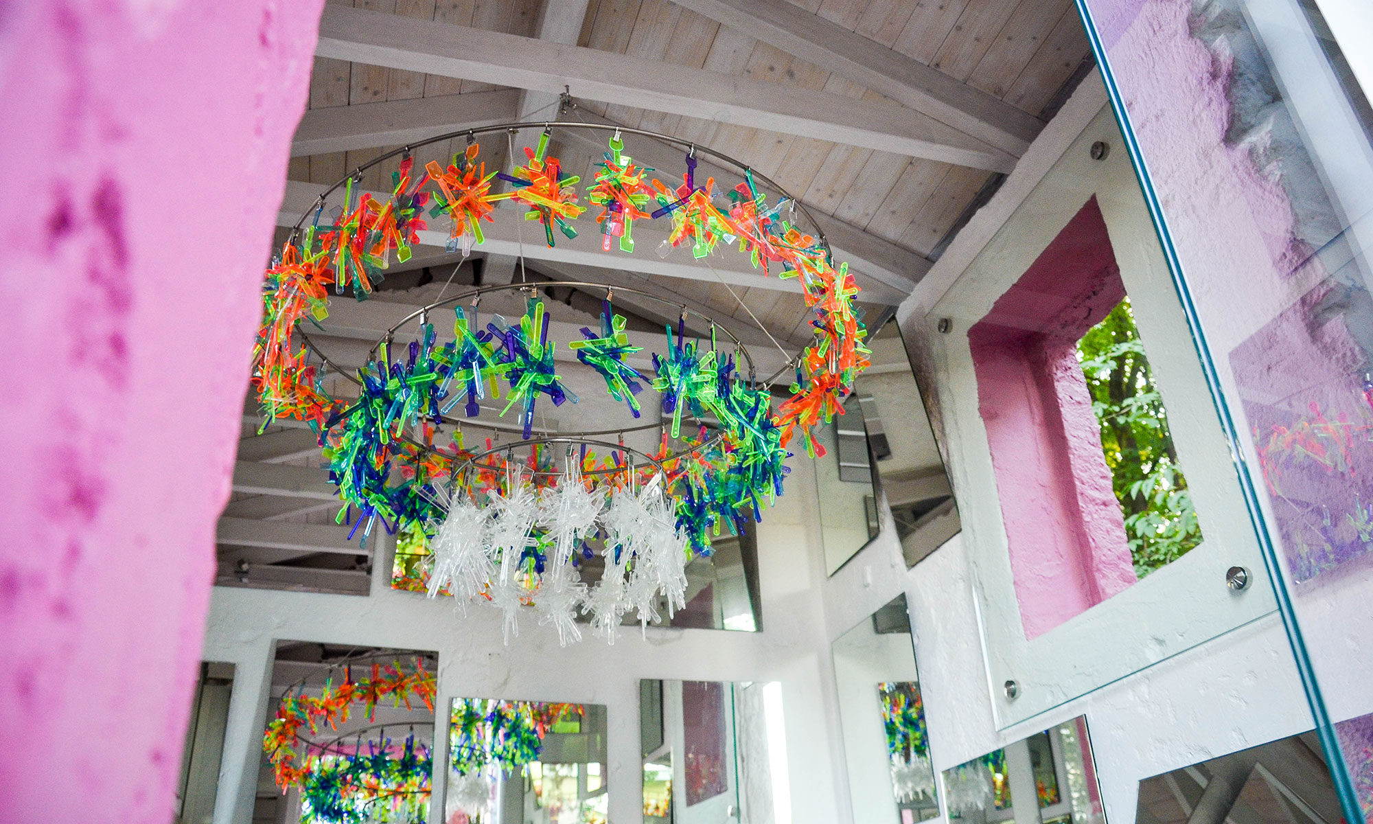 Das Innere des Gehäuses, das nicht betreten werden kann, hatte den Charakter eines Spiegelsaals. Viele Wandspiegel und ein zentraler Kronleuchter aus tausenden transparenten, aber farbigen Eislöffeln, verliehen dem Inneren eine zauberhafte Atmosphäre.