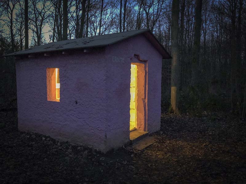 Außenhülle und Innenraum der ehemaligen Waldarbeiterhütte wurden mit Putz und Farbe instand gesetzt. Die Außenwände waren mit Kreide beschreibbar und wurden zur poetischen Projektionsfläche für Gedanken und Mitteilungen der Passant*innen.